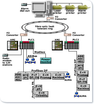 We were contracted to design, install and commissioning the Control System for two Water Treatment Plants in Ireland as part of a Water Augmentation Scheme. The control systems were PLC based with computer based MMIs. The systems were similar in architecture and interfaced to the plant instrumentation, valves and drive systems via intelligent communication networks. Thirteen independent links were provided with four different communications protocols. Communication between the PLCs & SCADA network is via a fibre optic, fault tolerant ring main which is distributed throughout the plant buildings. Additional operator interfaces are provided by colour touch screen MMIs located in each panel and in the laboratory. Remote dial-in facilities are provided for operator/supervisor control out-of-hours. Alarm Notification is provided to inform operators of plant alarms/ faults. Actual alarm details are transmitted to operator mobile phones using GSM technology. The Main Plant PLC controls 12 outstations via radio modem. Each outstation includes PLC, touch screen MMI and radio.